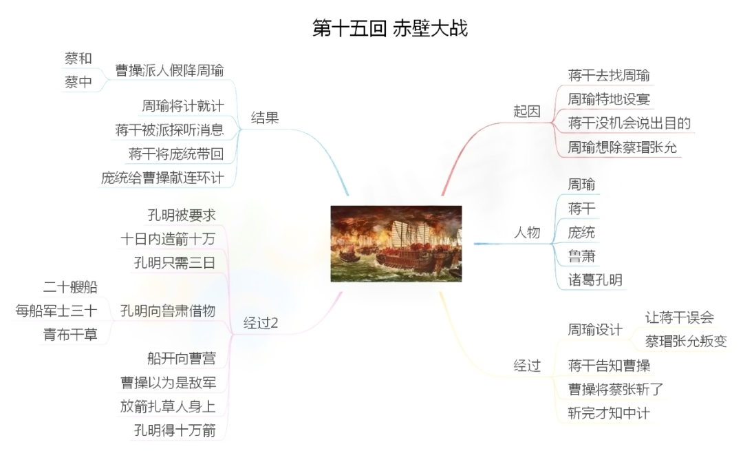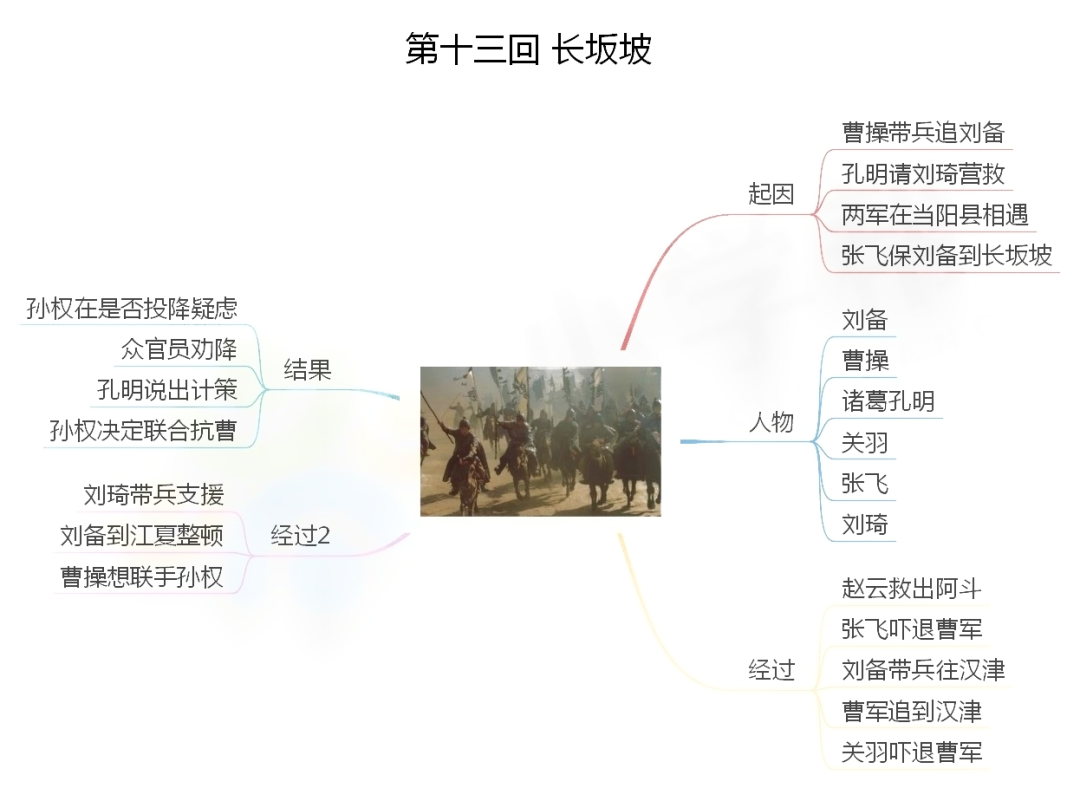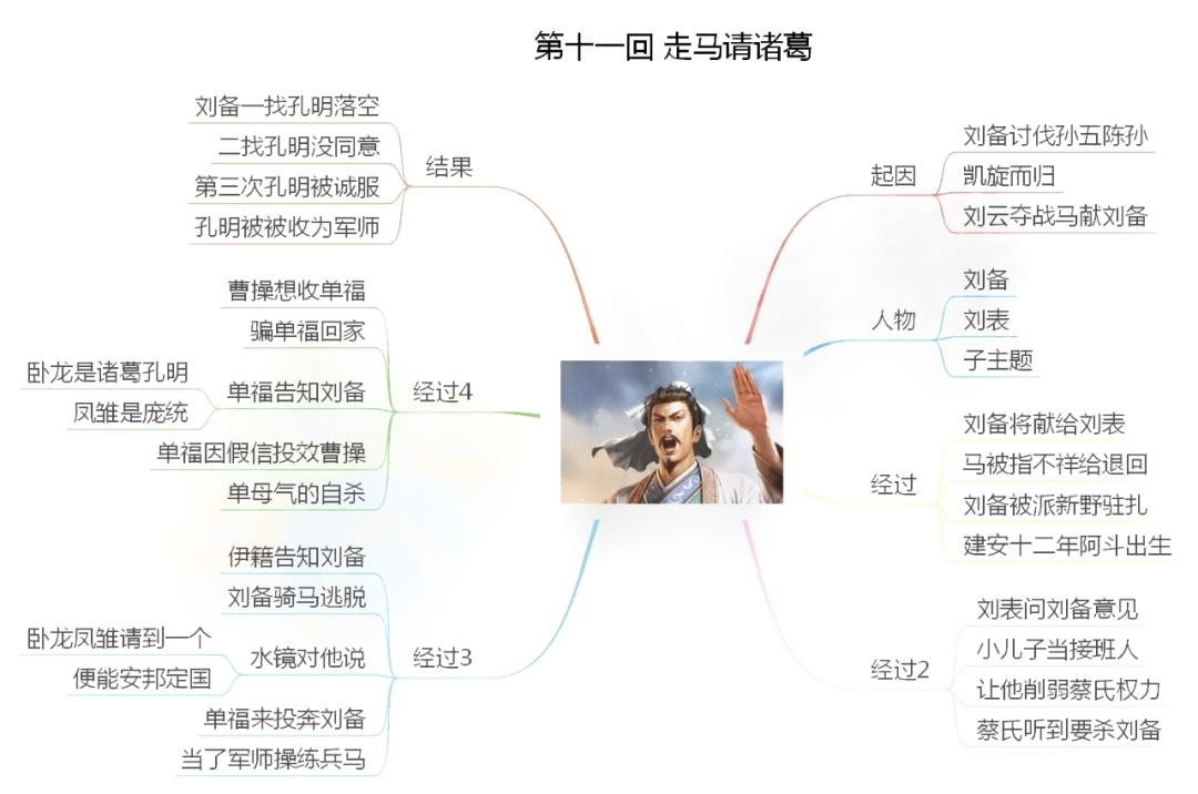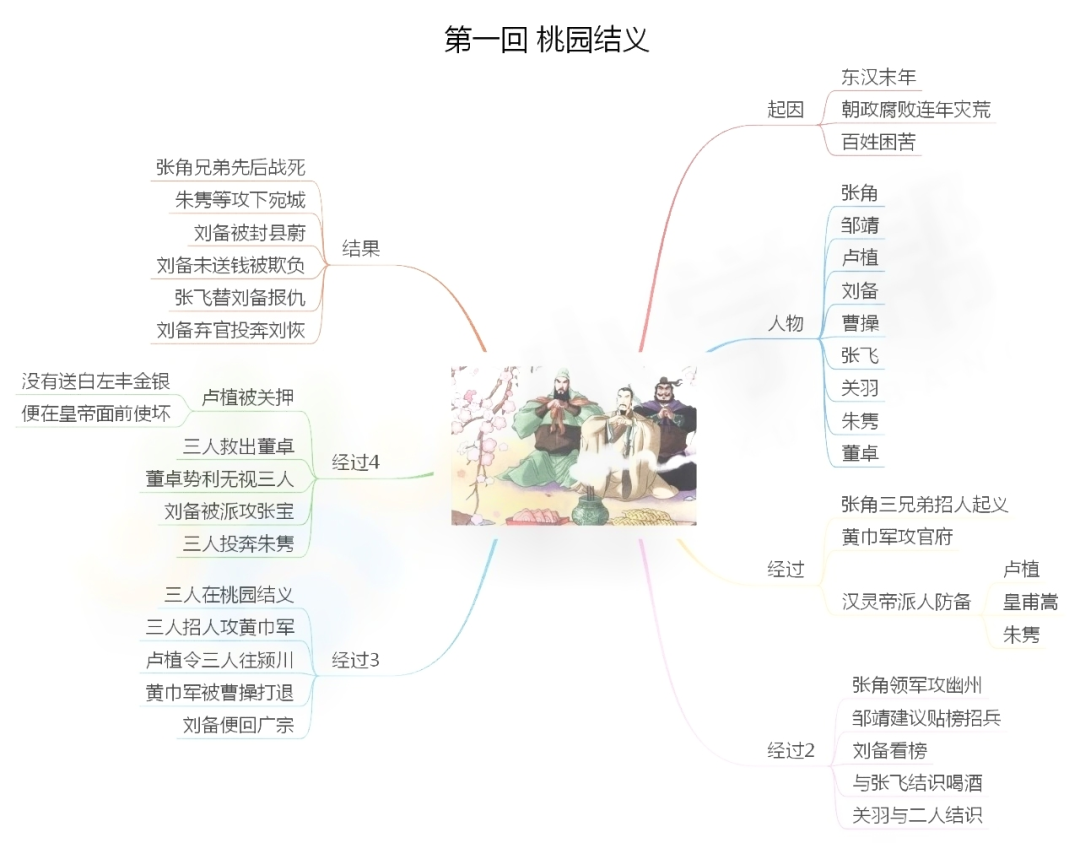 1.桃园三结义:东汉末年,朝政腐败,再加上连年灾荒,人民生活非常困苦。刘备有意拯救百姓,张飞、关羽又愿与刘备共同干一番事业。三人情投意合,选定张飞庄后一桃园。此时正值桃花盛开,景色美丽,张飞准备了青牛白马,作为祭品,焚香礼拜,宣誓完毕;三个人按年岁认了兄弟。刘备年长做了大哥,关羽第二,张飞最小做了弟弟。