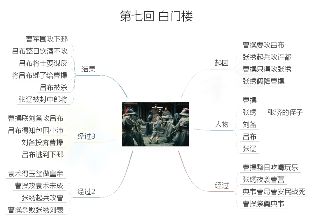 22.白门楼吕布殒命:下邳城失陷后,吕布被缚至白门楼。吕布恳请刘备在曹操面前说情,刘备点头示意。吕布对曹操表示降服,曹操问刘备何如,刘备以吕布认丁原、董卓为义父而又杀之为例,吕布大骂刘备大耳儿。曹操将吕布缢死。
