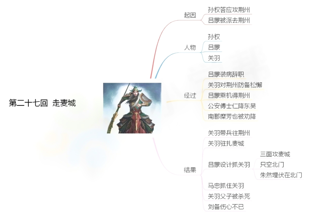 31.过五关斩六将:关羽因为没有曹操的公文,各关的守将均不敢放行,于是关羽就保护两位夫人,千里走单骑,过东岭关斩孔秀;过洛阳斩太守韩非。牙将孟坦;过池水关斩将卞喜。在荥阳斩太守王植;经滑州界到黄河渡口,斩夏候惇部将秦琪;渡过黄河到袁绍地方。