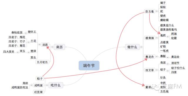 你看,小小一个端午节,把吃的喝的历史的文化的这么多东西都串到了一起。这其实是一种很棒的学习方法,也是一张思维导图: