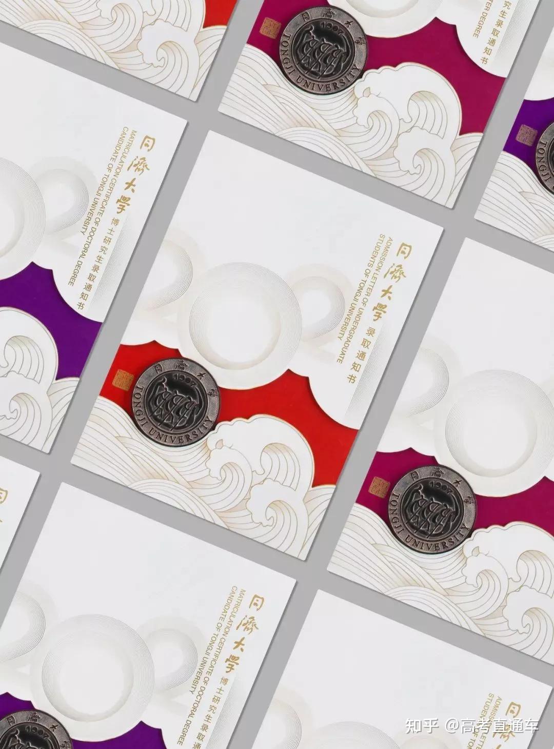 复旦大学的通知书以复旦红为主调,以云纹为背景,据了解,该校通知书设计从2018年一直到今年都采用了这款设计。该设计是由该校举办的通知书设计大赛选出的,比赛面向所有在校师生和校友。最终,这款由该校15级本科学生设计的,名为《红》的通知书设计杀出重围,并经过优化正式投入使用。