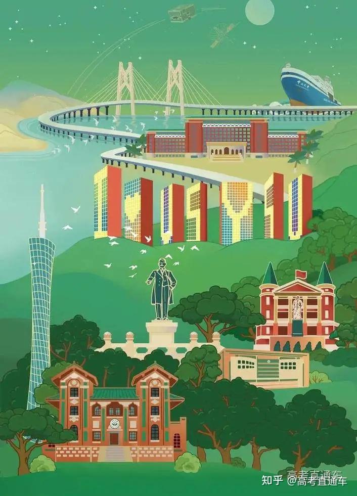 翻页而视,插画中展示的是中山大学地处粤港澳大湾区三座核心城市的“三校区五校园”办学格局,近年来,学校形成了文理医工农艺综合发展的学科格局,总体学科专业水平全面提升。