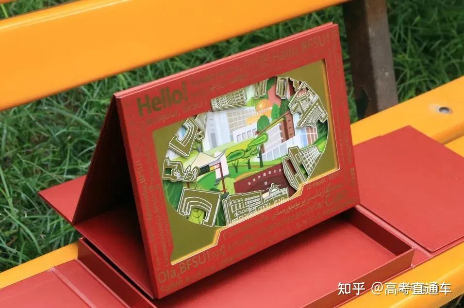 通知书采用中国传统的镂空工艺制作,运用中国园林艺术的视觉传达风格,以“你好,北外”的不同语言和校园天际线为主元素,与北外校门、图书馆、阿语楼等标志性建筑相融合,展现了北外深厚的底蕴和青春活力。通知书整体的形象烫印工艺和灵动的线条感兼具创新性与仪式感,强化了录取通知书的收藏意义和艺术价值。