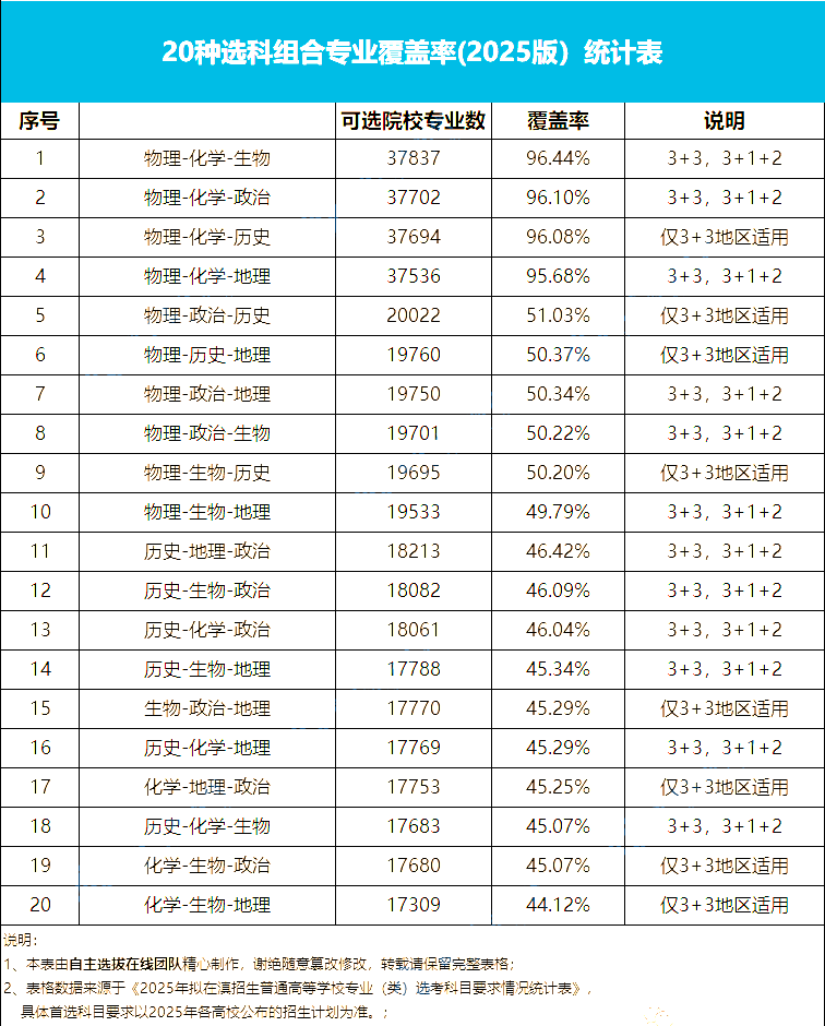 02组合专业覆盖率排名(2025版)此前,依据《普通高校本科招生专业选考科目要求指引(通用版)》要求,各高校已完成了2025年选考科目要求。根据云南省公布数据,整理最新2025年20种选科组合可选专业覆盖率排名情况,选科时重点参考!