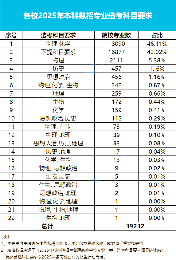 012025年选科专业数排名不同选科组合要求的专业数量及所占比例统计如下: