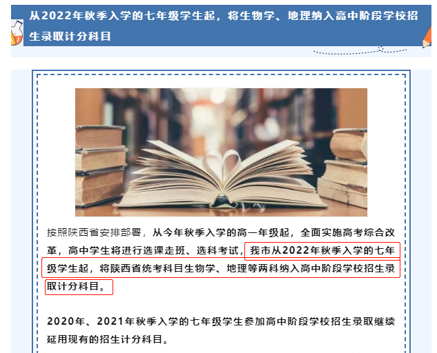 在2022年发布的《西安市2022年初中学业水平考试与高中阶段学校招生工作意见》中,有一条非常重要的信息就是:我市从今年秋季入学的七年级学生起,将陕西省统考科目生物学、地理等两科纳入高中阶段学校招生录取计分科目。