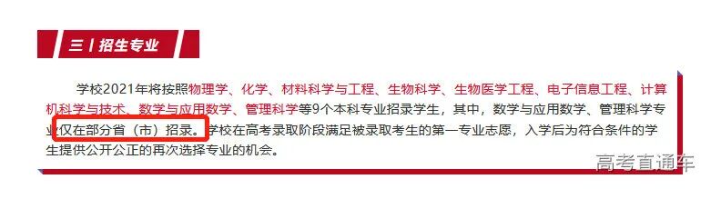 招生简章中以下几点信息要特别注意:1.学校的性质每所大学的招生简章中都会明显说明本校的性质,包括是国家公办还是民办大学、是不是双一流建设高校、学制等等。这是对一所大学的基本认识,从而也避免了考生受到那些野鸡大学的欺骗。2.招生计划信息部分高校会在简章中公布当年招生计划,这也是一个比较重要的信息,里面会有计划招生名额的相关信息,以及招生范围和一些专业限制等。以上海科技大学为例,其2021年招生简章中就提到了学校数学与应用数学、管理科学专业仅在部分省(市)招录。如下图所示: