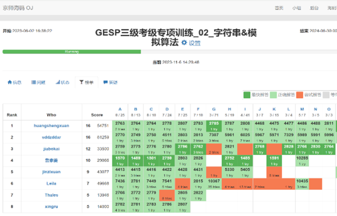 同时,我们拥有自己的竞赛训练平台。学生的编程训练提交时间点,代码问题一目了然,针对专项主题训练,学生完成情况,通过哪些题目,问题在哪里,轻松了解,入门测试,预设每一阶段的题单,对应阶段的知识点,学生能达到什么级别,准确判断。