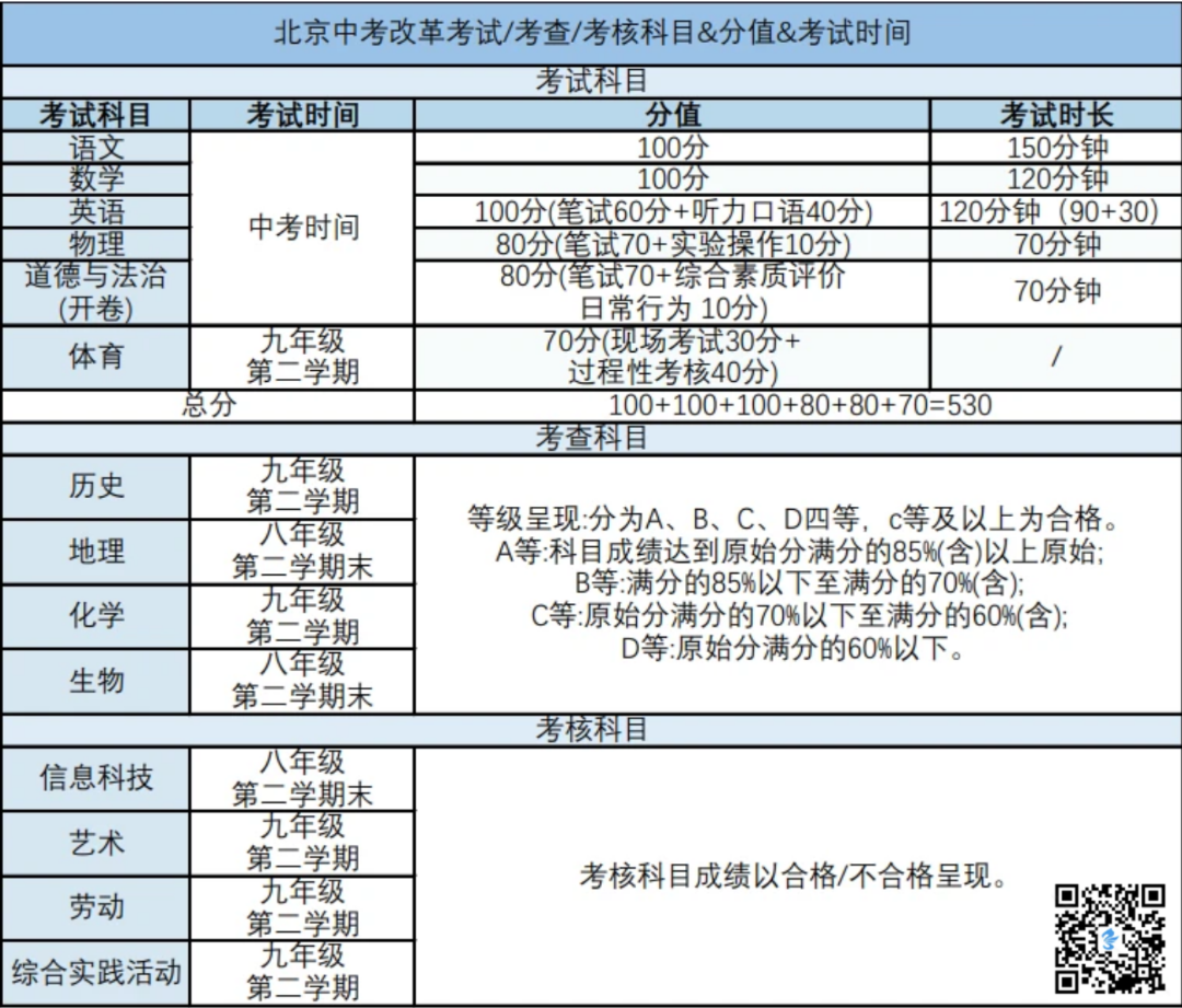 01中考改革考试科目&时间&变化①中考改革,将中考科目分为考试、考查和考核三类,考试考核分值上图所示。考试科目由全市统一命题、分区评卷;考查科目由各区负责命题并组织实施。考核科目由各区指导学校组织实施。