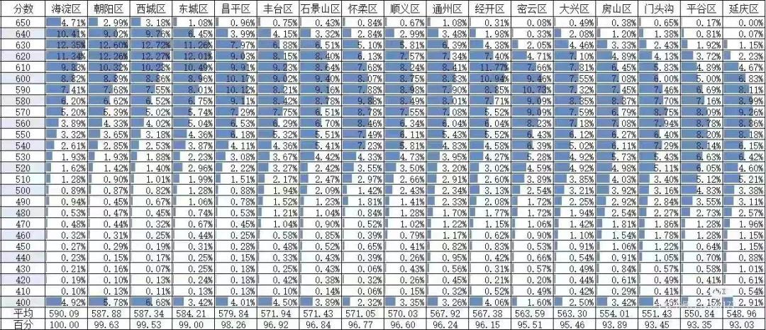 海淀考生总人数为19735人,在满分670分的情况下,只有945人低于400分,占比4.7%;东城是243人,占比3.2%,其他各城区也是半斤八两。