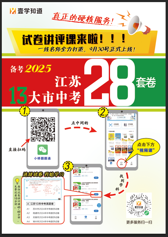 备考2025江苏13大市中考28套卷,解锁中考复习新方式!刷中考真题卷,只用中考真题28套!02使用视频课程的方法方法一:扫左上二维码进入小桥题题通小程序,点击下方中间位置选择视频课,即可看到28套卷配套视频课程