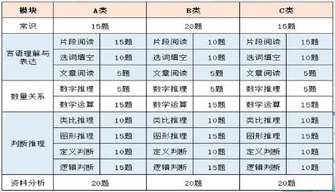 一般来说常识15道、言语30道,数量20道,判断推理50道,资料20道。