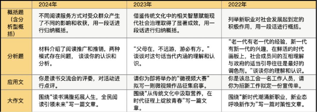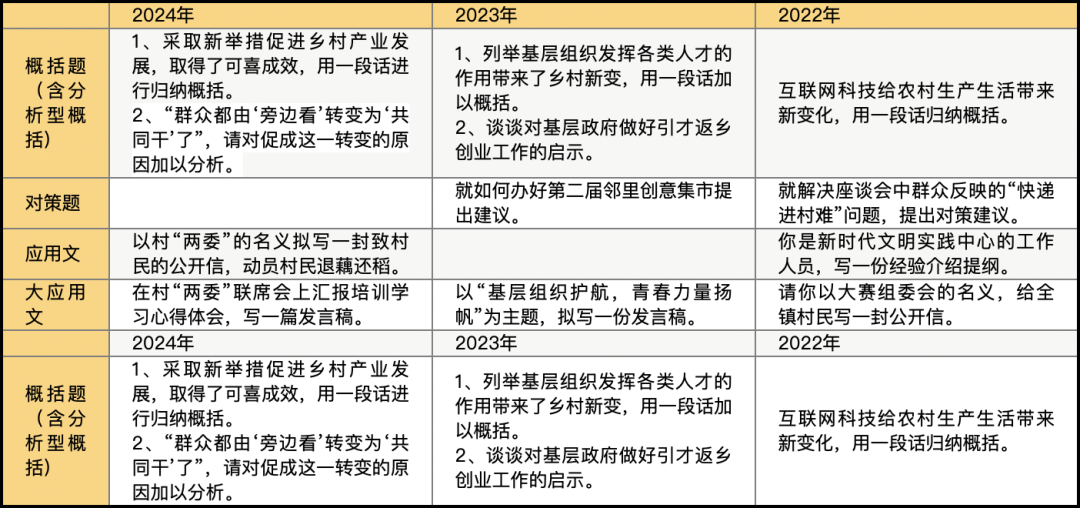 多是乡村振兴的内容,比如:产业振兴、乡风文明、全民阅读等;常考的题型是概括题、对策题、应用文和大应用文,分析题近三年未曾考查。