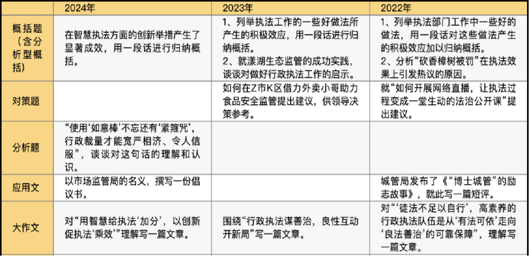 以执法内容为主,比如:法治社会、柔性执法等;常考的题型是概括题、对策题、应用文和大作文,分析题前两年未曾考查,2024年考了一题。