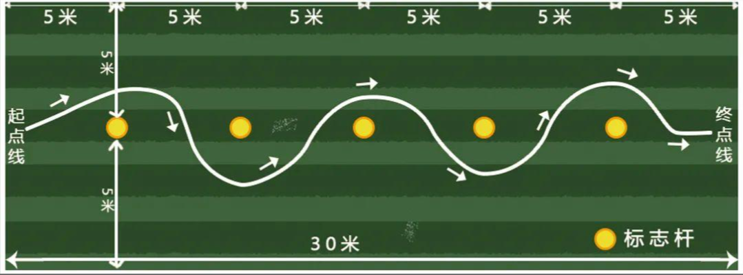 考生听到出发口令后开始向前运球依次过杆,考生和球均越过终点线即为结束;发令员发令后开始计时,考生与球均到达终点线时停表(运球路线见下图)每人测试两次,取最好成绩作为该项测试最终成绩。