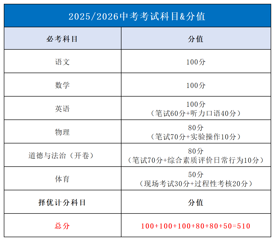 包括道德与法治,语文,数学,外语,物理,体育与健康,六门成绩以分数呈现,用于毕业和升学,语文,数学,外语分值均为100分,其中外语笔试分值为60分,听力和口语考试分值40分,