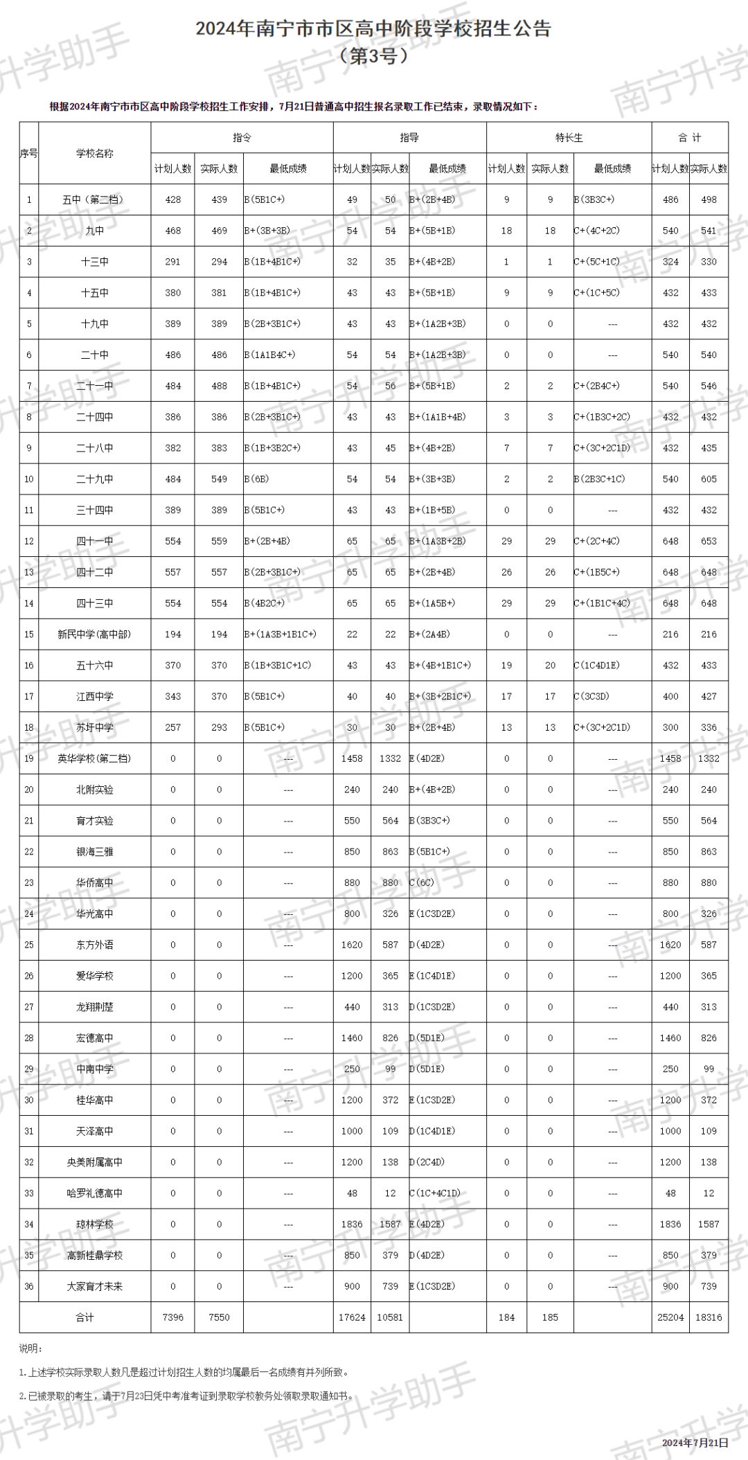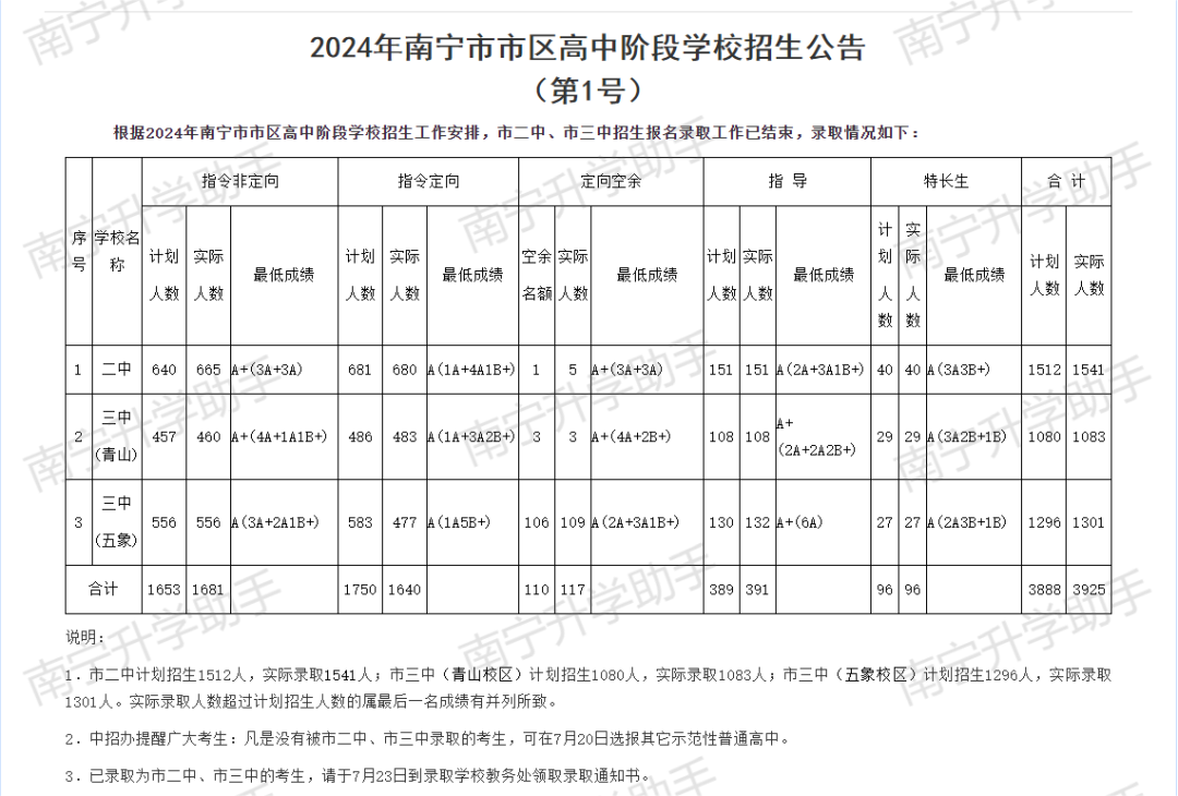 第一批次:南宁二中、南宁三中合计实际录取3925人,占中考人数(56818人)的6.9%;