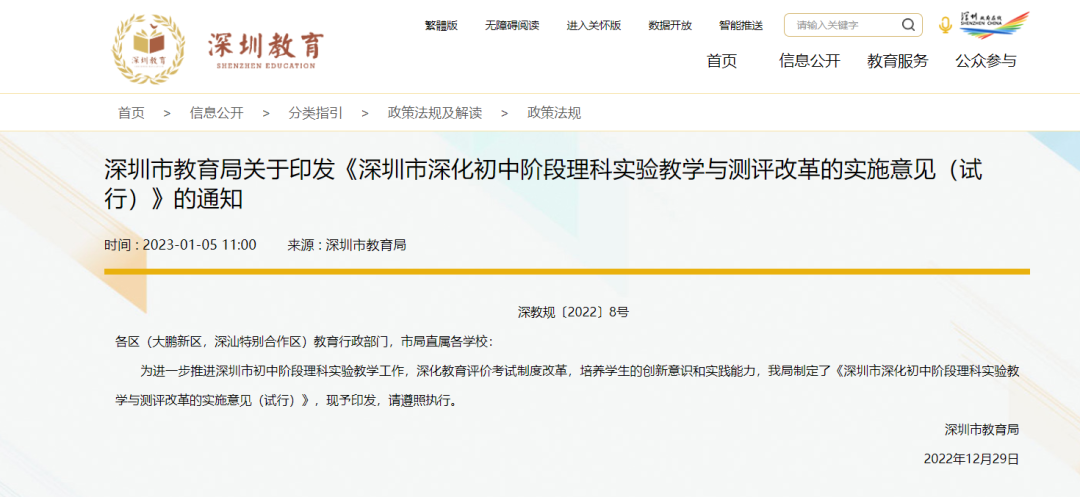 2023年1月,深圳教育局发布《关于深化初中阶段理科实验教学与测评改革的实施意见(试行)》提到,2025届的理化实验操作考试成绩按笔试成绩的10%计入科目成绩总分,作为学生毕业和升学的依据,即理化实验操作计算成绩将计入中考总分。