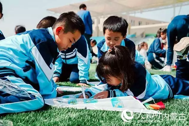 康巴什区第五小学东校区学生正在画风筝。人民网记者 富丽娟摄