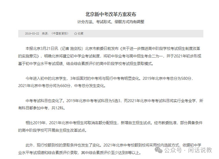 当时,北京市教委发布《关于进一步推进高中阶段学校考试招生制度改革的实施意见》,明确北京将建立初中学业考试制度,将初中毕业考与高中招生考合二为一,并于2021年形成基于初中学业水平考试成绩、结合综合素质评价的高中阶段学校考试招生录取模式。即2019年北京中考总分为580分,在2021年北京中考总分将为660分。2019年北京中考考试科目为5选3,而2021年北京中考考试科目将实行全考全学,所有科目都参加中考,共12科。(下图为教育部官网下载)