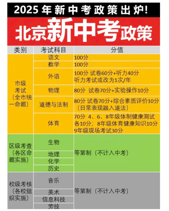 2025年开始,北京中考将取消化学,生物,地理,历史,改为考核科目,不计入中考成绩。考试科目为数学(100分),语文(100分),外语(60分笔试+40分听力),物理(80分),道德与法治(80分),体育,其中道法改为开卷。