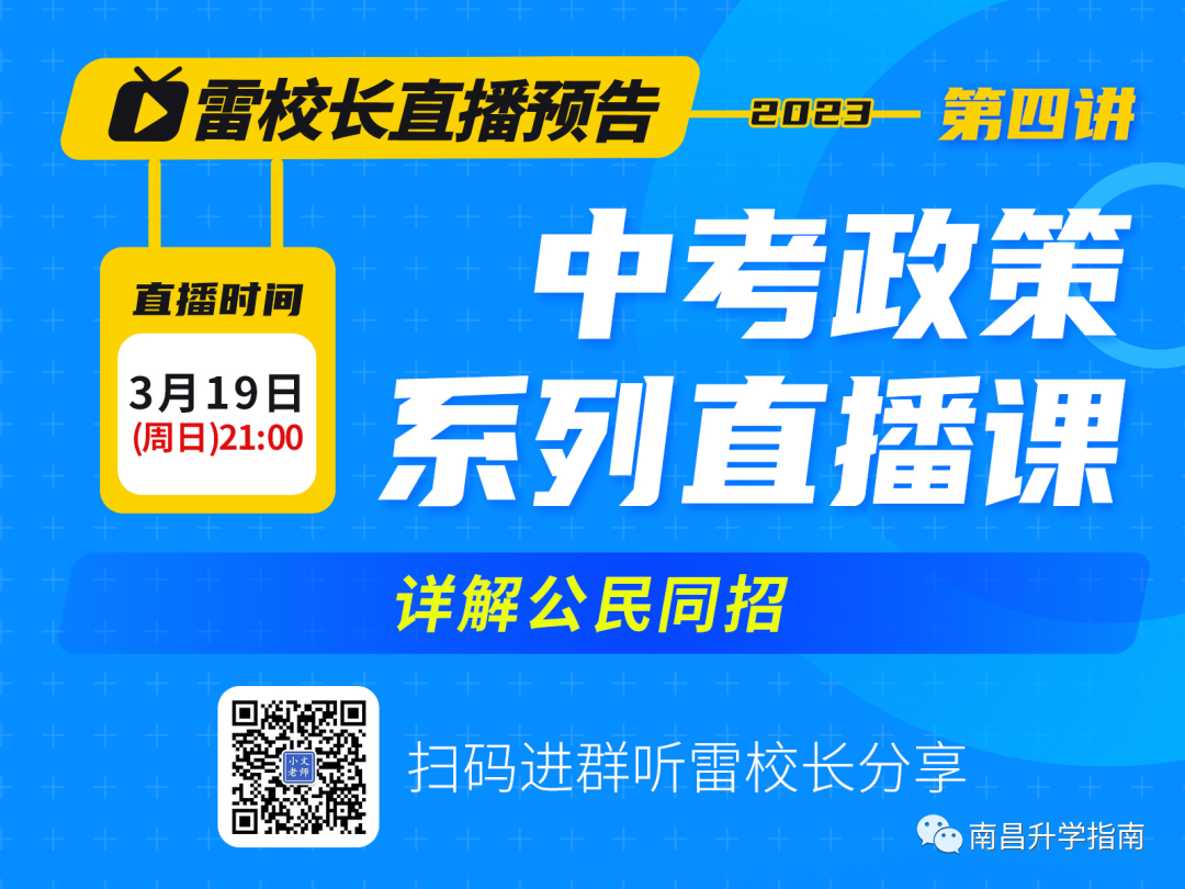 3月19日(周日)21:00雷校长2023中考政策直播课第四讲#详解公民同招#添加老师立即预约~声明:本文根据进贤县教体局、南昌市教育局、南昌市教育考试院消息,由南昌升学指南整理发布,转载请注明来源。