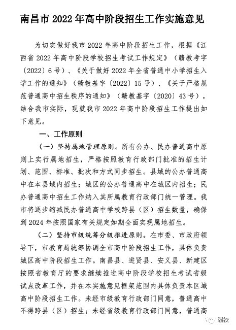 为切实做好我市 2022 年高中阶段招生工作,根据《江 西省 2022 年高中阶段学校招生考试工作规定》(赣教考字 〔2022〕6 号)、《关于做好 2022 年全省普通中小学招生入 学工作的通知》(赣教基字〔2022〕15 号)、《关于严格规 范普通高中招生秩序的通知》(赣教基字〔2020〕43 号), 结合我市实际,现就我市 2022 年高中阶段招生工作提出如下意见。