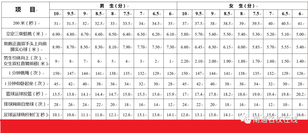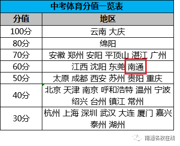 我们来看南通现行中考体育方案:考试时间定了!2021年南通市体育中考评分标准、测试方法与测试规则来了!目前南通考生体育考试成绩包括体育过程性测试、毕业升学体育统一考试(以下简称“体育统考”)两个内容组成。体育过程性测试30分,体育统考30分,总成绩共计60分,计入中考总分。其中30分的评分标准是:南京 中考总分700分,体育40分