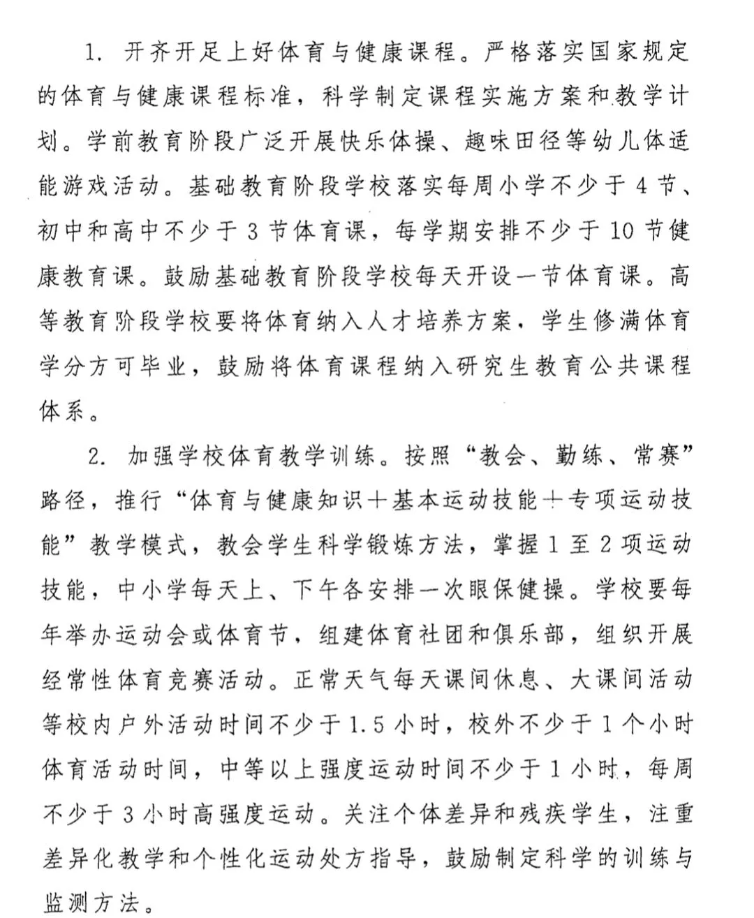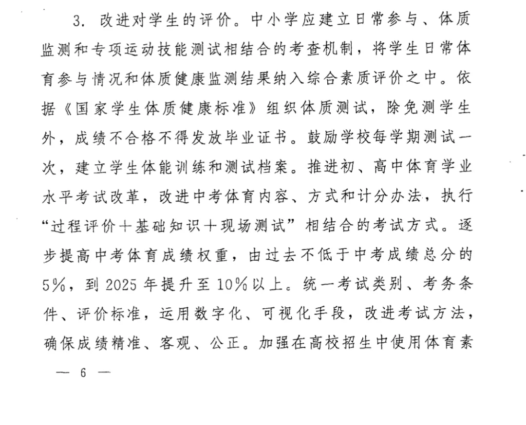 《关于全面加强和改进新时代学校体育工作的实施意见》明确,推进初、高中体育学业水平考试改革、改进中考体育内容、方式和计分方法。执行“过程评价+基础知识+现场测试”相结合的考试方法。逐步提高中考体育成绩权重,由过去不低于中考成绩总分的5%,到2025年提升至10%以上。相关链接: