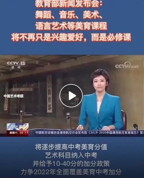 早在2020年10月16日,在教育部新闻发布会上,教育部体育卫生与艺术教育司司长王登峰介绍,“目前全国已经有4个省开展美育中考计分,同时还有6个省、12个地市已经开始了中考美育的计分,分值在10分到40分之间,云南省从今年开始要增加到40分。这个试点已经有了相当的基础,下一步我们要把美育中考的工作做得更加扎实,到2022年力争全覆盖,全面实行美育中考。”