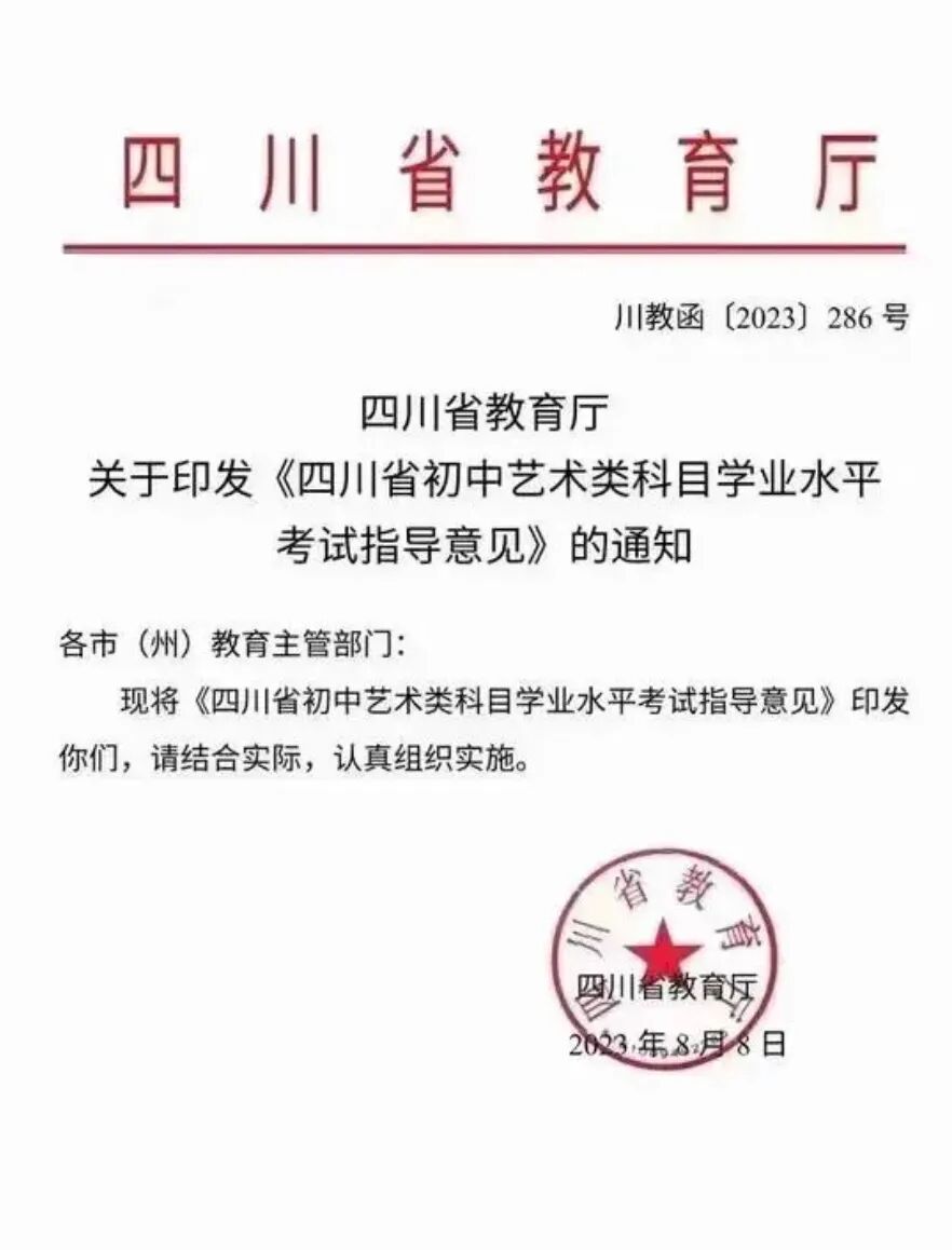 日前,四川省教育厅印发《四川省初中艺术类科目学业水平考试指导意见》,规定:从今年入学的初中新生开始,初中一、二、三年级艺术素质测评和初中三年级的艺术技能测试成绩全部计入考试成绩,纳入高中阶段学校招生录取的依据。考试由各市(州)统一自主命题。