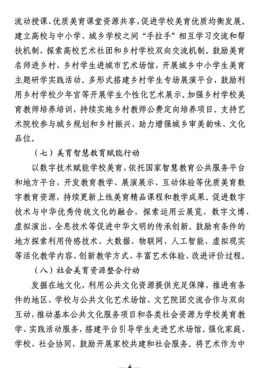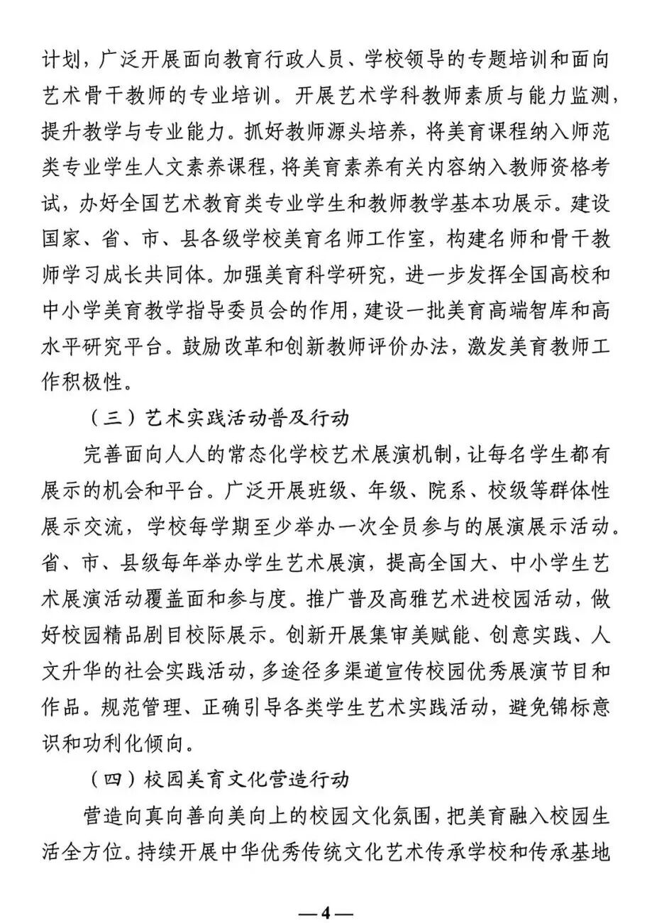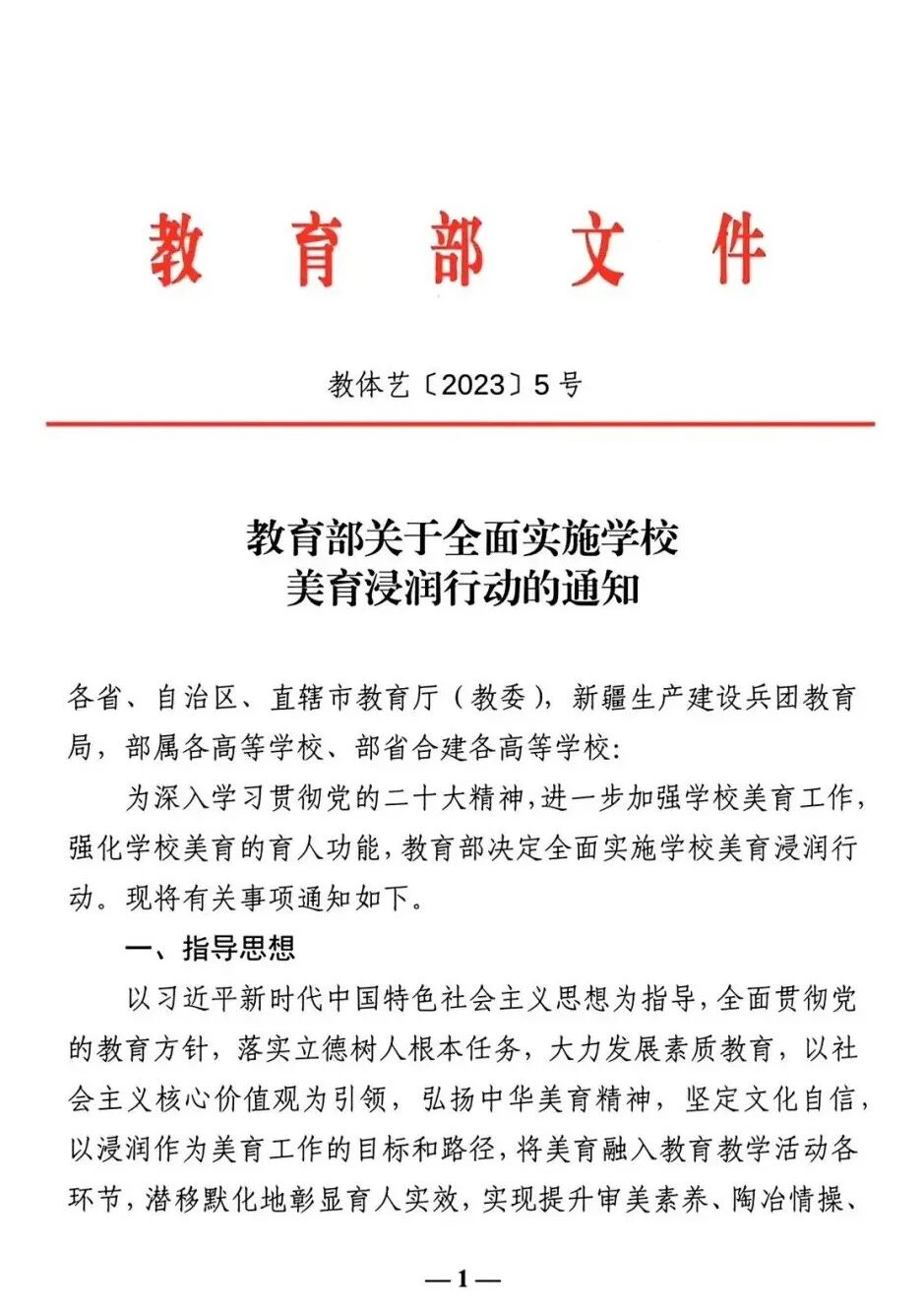 2023年12月,国家教育部印发《关于全面实施学校美育浸润行动的通知》,以美育浸润学生、教师、学校,到2027年,美育课程教育教学质量全面提升。通知提出,面向人人建立常态化学生全员艺术展演机制,广泛开展班级、年级、院系、校级等群体性展示交流。推广普及高雅艺术进校园活动。